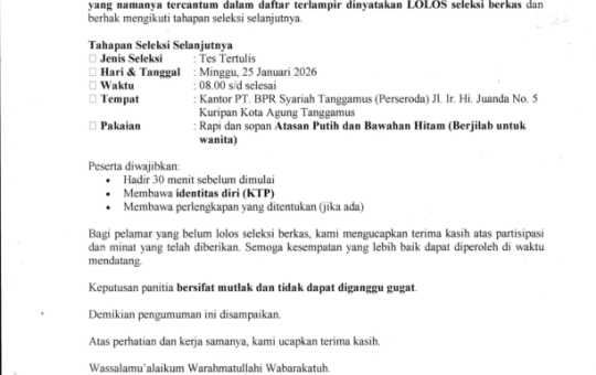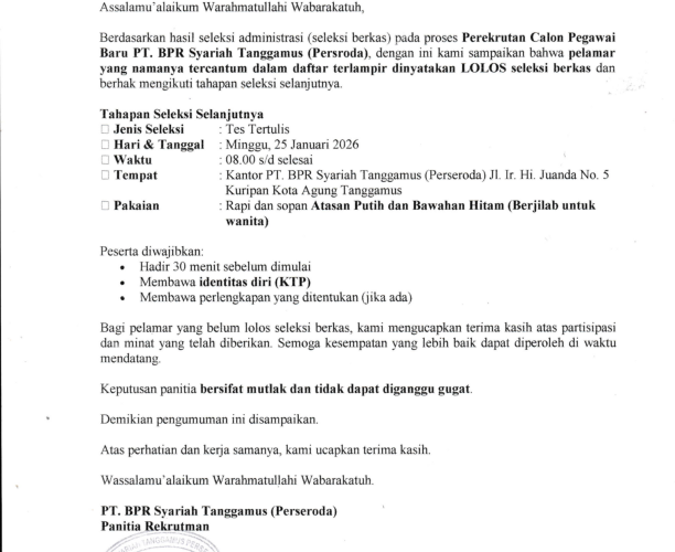 PENGUMUMAN HASIL SELEKSI CALON PEGAWAI TAHAP 1 LOWONGAN PEKERJAAN 2026 LOWONGAN PEKERJAAN PERUBAHAN NOMENKLATUR PEMBIAYAAN