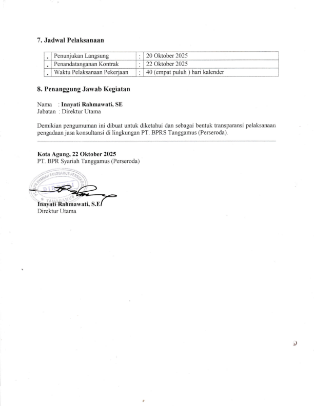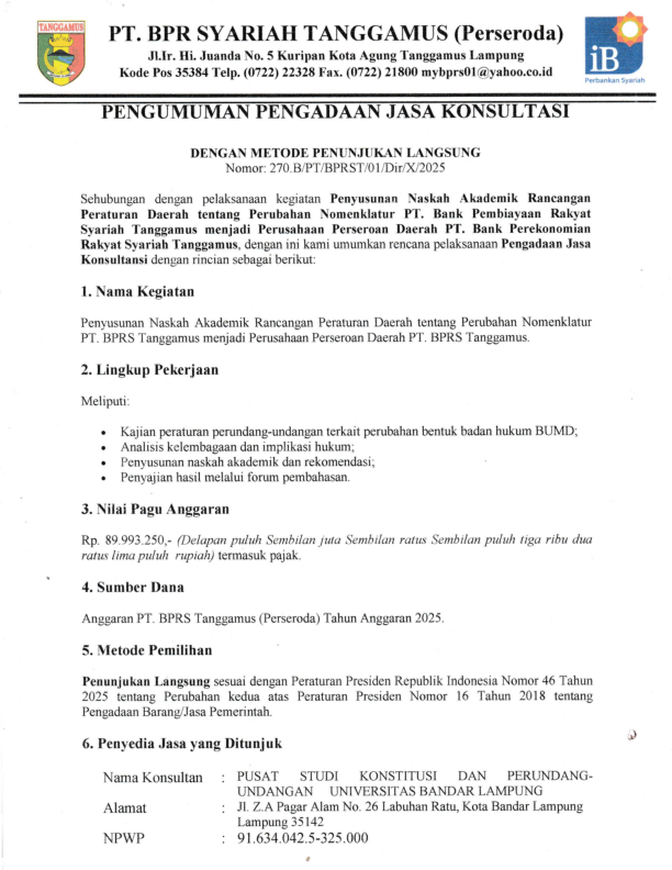 Rekruitment Anggota Komisaris dan Direktur PT BPR Syariah Tanggamus
