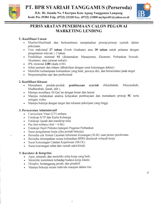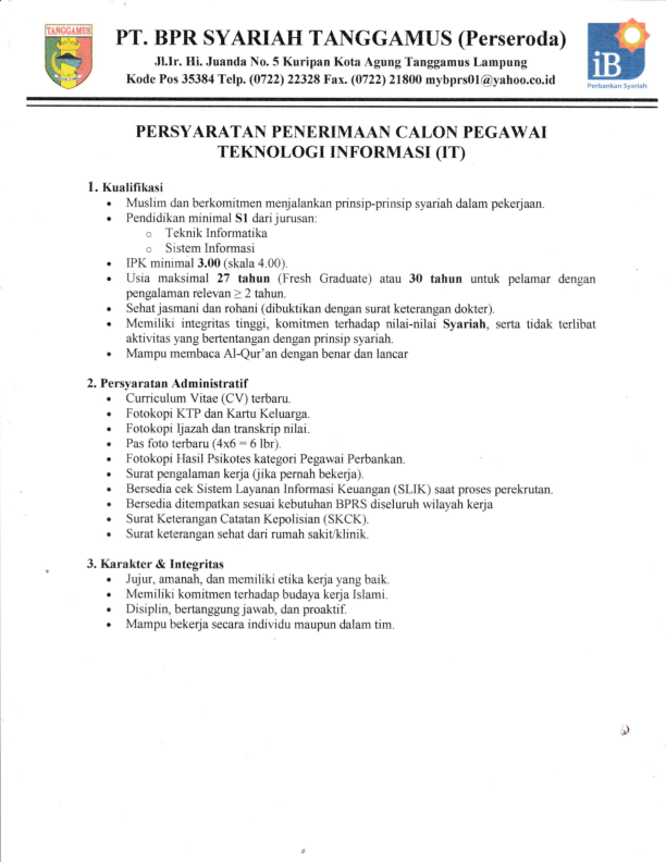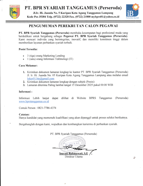 Rekruitment Anggota Komisaris dan Direktur PT BPR Syariah Tanggamus